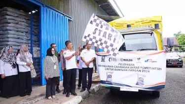 Pendistribusian bantuan pangan dilepas secara simbolis atas persetujuan PJ Bupati Sinjai, TR Fahsul Falah oleh Sekretaris Daerah (Sekda) Sinjai, Andi Jefrianto Asapa di pelataran gudang Perum Bulog Sinjai, di Desa Saukang, Kecamatan Sinjai Timur.