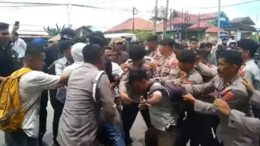 Polisi mengamankan pengunjuk rasa di depan Mako Polresta Kendari, Selasa (27/2/2024)