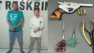 Kendari, tvOnenews.com - Anggota Satreskrim Polresta Kendari menangkap dua pria yang terlibat dalam kasus penyalahgunaan senjata api dan senjata tajam di Kota Kendari, Sulawesi Tenggara, Selasa (28/5/2024).