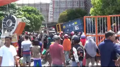 Makassar, tvOnenews.com - Truk kontainer yang mengangkut minyak goreng terbalik di halaman menara Phinisi Universitas Negeri Makassar (UNM), jalan Andi Pangeran Pettarani Makassar, warga pun berebutan dan saling desak-desakan untuk mendapatkan minyak curah tumpahan dari kontainer tersebut.