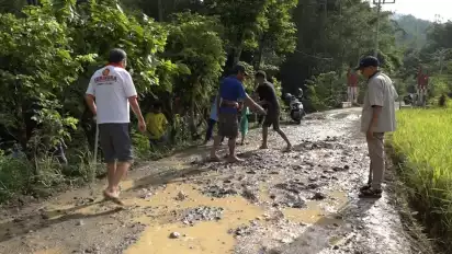 Bermodalkan ember bekas dan sekop, satu per satu warga kemudian mengangkat pasir dari sungai untuk digunakan menimbun jalan penghubung kecamatan yang menurut warga telah mirip dengan kubangan kerbau. Sebab jika musim hujan tiba, jalan ini dipenuhi dengan genangan air. Namun jika musim kemarau, debu di jalan akan beterbangan masuk ke dalam rumah warga yang berada di pinggir jalan poros.