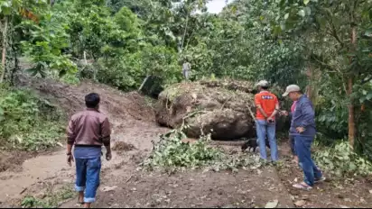 Kondisi ini menyebabkan lereng setinggi Seratus meter menjadi labil dan bergeser, hingga membawa material berupa tanah dan batu berukuran besar.