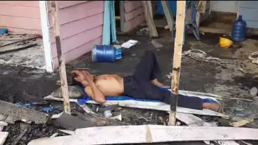 Seorang pria yang memilih beristirahat di tengah sisa rumah yang terbakar.