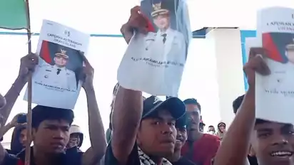 Buton, tvOnenews.com - Puluhan warga dan mahasiswa di Kabupaten Buton, Sulawesi Tenggara, mendatangi Polres Buton, Kamis (18/9/2025) untuk melaporkan orang hilang atas nama Alfin Akawijaya Putra yang merupakan Bupati Buton. Aksi yang terbilang kocak ini dilakukan lantaran sudah hampir sebulan Sang Bupati tidak pernah terlihat oleh warga.
