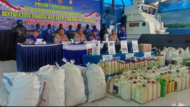 Barang bukti destructive fishing yang diamankan tergolong besar, mulai dari 11 karung pupuk 25 kilogram, 89 jerigen bahan peledak siap ledak, 64 botol bom ikan, 369 detonator, 74 potong sumbu, kompresor, selang, kaki katak, dakor, hingga bahan campuran peledak lainnya.