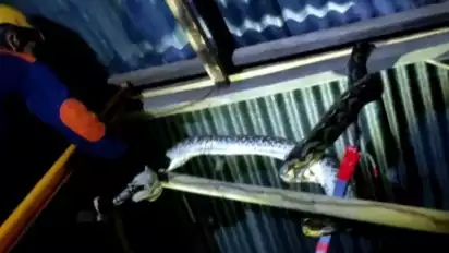 Setelah berjibaku sekitar dua jam untuk mengevakuasi ular raksasa itu, akhirnya petugas Damkar berhasil mengevakuasi ular raksasa dari atap rumah warga.