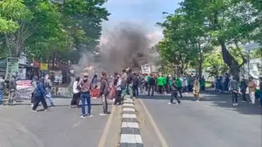 Terpantau juga, mahasiswa UIN Alauddin Makassar ini membakar ban bekas di tengah jalan dan membentangkan spanduk sembari bergantian berorasi.