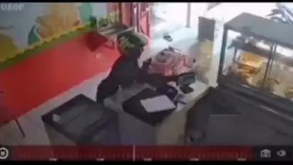 Dalam rekaman CCTV tersebut terlihat seorang pria pengendara motor awalnya melintas di depan gerai.