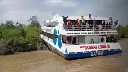 Kepulauan Meranti, tvOnenews.com - Kapal Ferry Dumai Line 9 rute menabrak hutan bakau dan kandas di perairan Anak Ayam, di Desa Sungaitohor, Kecamatan Tebingtinggi Timur, saat berlayar dari Tanjung Balai Karimun, Kepulauan Riau hendak menuju Selatpanjang, Kabupaten Kepulauan Meranti, Provinsi Riau, sekitar pukul 11.00 WIB, Ahad (12/2/2023).