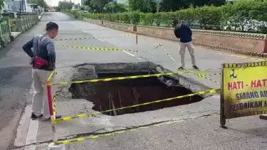 Lampung Utara, tvOnenews.com - Jalan Lintas Tengah Sumatera di Lampung tepatnya di Jalan Alamsyah RPN, Kelurahan Kelapa Tujuh, Kotabumi Selatan, Kabupaten Lampung Utara, mengalami ambrol sedalam 4 meter.