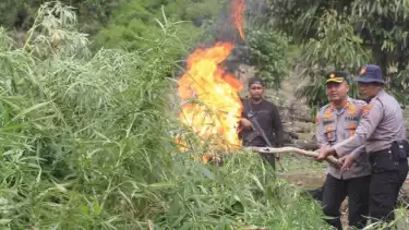 Aceh Barat, tvOnenews.com – Jajaran Polres Aceh Barat melakukan penggerebekan terhadap 32 hektare ladang ganjang di kawasan hutan lindung Beutong Ateuh Nagan Raya, Aceh. Setelah sebagian barang haram tersebut dikumpul untuk barang bukti, petugas langsung memusnahkan seluruh ladang ganja tersebut dengan cara membakarnya.