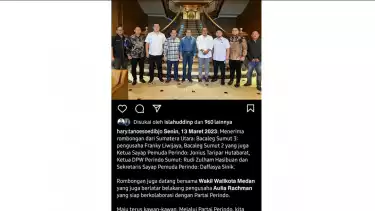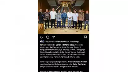Medan, tvOnenews.com - Postingan foto Senin (13/3/2023) dari akun resmi instagram Ketum Perindo Hary @hary.tanoesoedibjo buat kaget banyak masyarakat. Bahkan hal itu pun ramai diposting di status Whatas App. Apakah postingan itu memaknai atau terindikasi seorang pengusaha yang saat ini menjabat Wakil Walikota Medan hijrah ke partai politik lain. Sebab, selama ini Aulia Rachman orang yang dimaksud merupakan kader serta pengurus partai Gerindra dengan Ketua Umumnya H Prabowo Subiyanto.