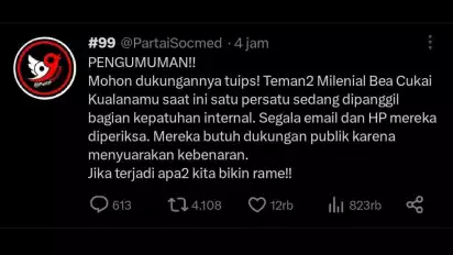 Mohon dukungannya tuips!, Teman2 Milenial Bea Cukai Kualanamu saat ini satu persatu sedang dipanggil bagian kepatuhan internal. Segala email dan HP mereka diperiksa, mereka butuh dukungan publik karena menyuarakan kebenaran. Jika terjadi apa2 kita bikin rame!!!,” demikian cuitan akun tersebut.