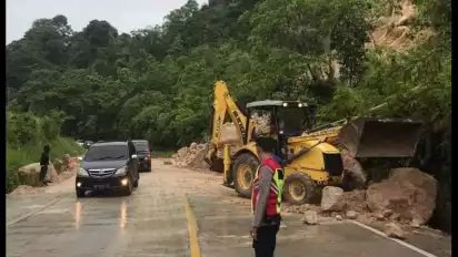Sijunjung, tvOnenews.com - Peristiwa tanah longsor terjadi di Jalan Lintas Sumatera, tepatnya diperbatasan Kabupaten Sijunjung dan Dharmasraya pada Minggu (23/4/2023) pagi.