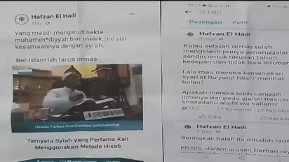"Yang masih menganut sekte Muhamm*diyah segeralah bertaubat, ini sisi kesamaannya dengan Syiah. Apa yang dicari dari ormas pemecah belah ini?" katanya melalui akun Facebook Hafzan El Hadi.