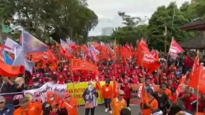 Palembang, tvOnenews.com - Ribuan buruh di Sumsel yang tergabung dalam Konfederasi Kongres Aliansi Serikat Buruh Indonesia (KASBI) merayakan Hari buruh Internasional atau May Day dengan demo di depan kantor DPRD Provinsi Sumsel, Senin (1/5/2023).