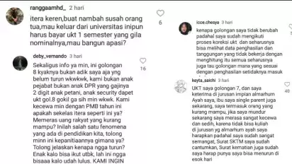 Bahkan ada yang merasa bahwa golongan tidak berubah, padahal sudah mengikuti prosesi koreksi UKT. "Kenapa golongan saya tidak berubah, padahal saya sudah mengikuti proses UKT dan seharusnya bisa melihat data penghasilan dan tanggungan tidak bekerja, dengan menghitung itu semua, yang mana sesuai penghasilan," kata @icce.chesya