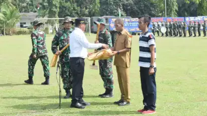 Serdang Bedagai, tvOnenews.com - Dalam pencapaian program lintas sektoral antara TNI dan Pemkab setempat, Kodim 02/04/ Deliserdang laksanakan Tentara menunggal membangun desa atau TMMD ke - 166 tahun anggaran 2023 di lapangan stadiun 26 Juli Desa Rambung Sialang, Kecamatan Sei Rampah, Kabupaten Serdang Bedagai, Sumatera Utara, Rabu (10/5/2023).