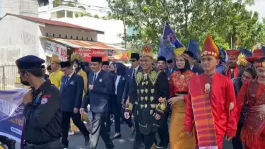 Medan, tvOnenews.com - Ratusan relawan Partai NasDem menggunakan baju adat dan baju kaos Partai antarkan bacaleg dengan longmarch dari kantor Partai Nasdem Sumut ke kantor KPU Sumut.