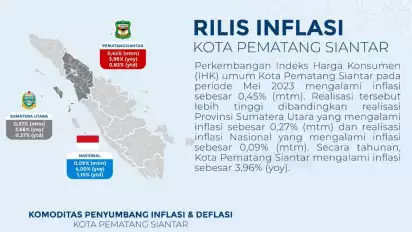 Pematangsiantar, tvOnenews.com - Perkembangan Indeks Harga Konsumen (IHK) umum Kota Pematang Siantar, Sumatera Utara, pada periode Mei 2023 mengalami inflasi sebesar 0,45% (mtm).