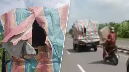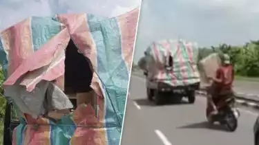 Perekam video yang juga merupakan pengendara mobil memberitahu pengemudi pikap bahwa muatan barangnya telah dicuri oleh bajing loncat.