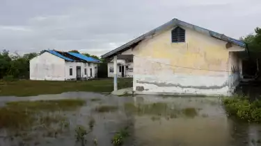 Tiap kali rob menerjang desa, SD Negeri 16 turut terkena dampaknya. Dengan ketinggian 15-30 sentimeter, air rob menggenangi sekolah.