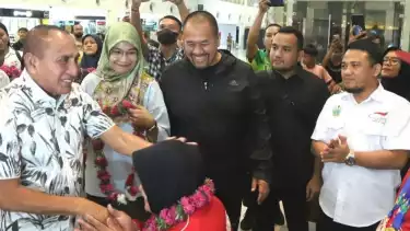 Medan, tvOnenews.com - Satu persatu atlet dan pelatih yang baru saja membela Indonesia di ASEAN Para Games 2023 di Kamboja, mendapat kalungan bunga langsung oleh Gubernur Sumatera Utara, Edy Rahmayadi yang didampingi Kadispora Sumut H Baharuddin Siagian di pintu kedatangan Bandar Udara (Bandara) Kualanamu Deli Serdang, Sumatera Utara.