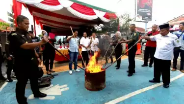 “Barang bukti ini hasil sitaan perkara yang ditangani periode Oktober 2022 hingga Juni 2023. Seluruhnya ada 84 perkara. Pemusnahan sabu - sabu, ganja dan ekstasi dilakukan dengan cara dihancurkan menggunakan blender sedangkan Senpi dan Sajam dilakukan dengan cara dipotong menggunakan mesin pemotong besi dan barang bukti lain dengan cara dibakar." Kata Agung.