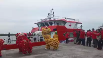 Kedatangan kapal rumah sakit apung Laksamana Malahayati disambut oleh pengurus DPD PDI Perjuangan Sumut dan DPC PDI Perjuangan Kota Medan serta barongsai.