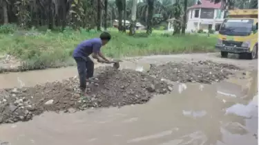 Padang lawas, tvOnenews.com - Kecewa dengan kondisi jalan Jalan Lintas Sumatera ( Jalinsum) yang sudah rusak berat dan tidak ada perhatian dari Pemerintah Provinsi Sumatera Utara, masyarakat yang di prakasai oleh tokoh masyarakat sekaligus mantan Camat Sosa Timur yang pertama, Darwin Simatupang. S.Sos. menimbun jalan dengan menggunakan sertu, Sabtu ( 15/7/2023).