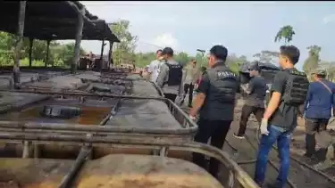 Musi Banyuasin, tvOnenews.com - Aparat Kepolisian Polda Sumatra Selatan, dan Polres Nusi Banyuasin, menggerebek puluhan gudang penyimpanan minyak ilegal dan masakan minyak tau penyulingan minyak ilegal, dikawasan Kelurahan mangun jaya, Kecamatan Banat Toman, Musi Banyuasin, Sabtu (29/7/2023).