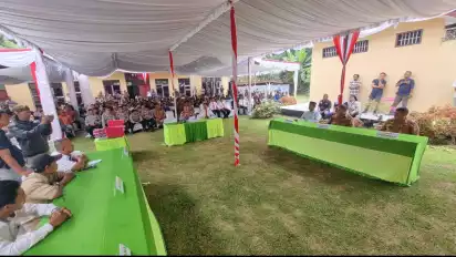 Simalungun, tvOnenews.com - Pertama di Indonesia, Petugas Polsek Tanah Jawa, Wilkum Polres Kabupaten Simalungun, Sumatera Utara, melakukan sidang massal terbuka serta pemberian Restoratif Justice kepada 70 tersangka kasus tindak pidana pencurian sawit milik Perkebunan PTPN IV yang tersebar di beberapa wilayah di Kabupaten Simalungun.