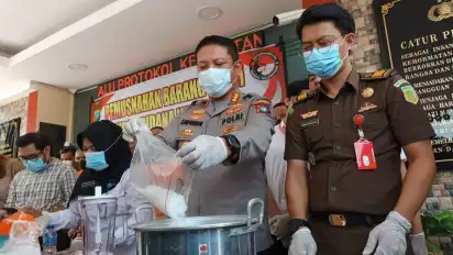 Ribuan gram sabu ini dimusnahkan dengan cara dilarutkan dengan air yang mendidih. Sementara pil ekstasi dimusnahkan dengan cara dihancurkan menggunakan blender.