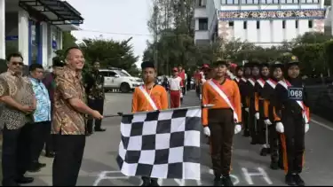 Karo, tvOnenews.com - Asisten Pemerintahan dan Kesejahteraan Rakyat Sekda Kabupaten Karo, Caprilus Barus melepas gerak jalan antar pelajar tingkat SD-SMP di Kabupaten Karo dalam rangka merayakan hari Kemerdekaan Republik Indonesia ke-78, di halaman Kantor Bupati Karo Sumatera Utara, Kamis (03/08/2023).