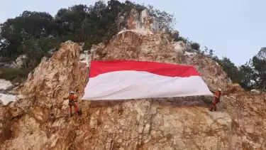 Tanjungpinang, tvOnenews.com - Kantor Pencarian dan Pertolongan (SAR) Natuna mengibarkan bendera merah putih raksasa di tebing tinggi yang ada di Teluk Depeh, Selat Lampa, Kabupaten Natuna, Kepulauan Riau.