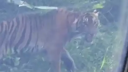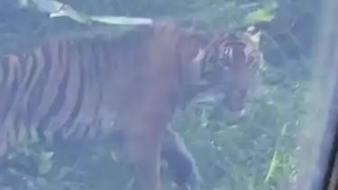 Aceh Timur, tvOnenews.com - Momen menegangkan dimana seekor Harimau Sumatera memperlihatkan dirinya ketika warga sedang melintas di jalan Pining Kabupaten Gayo Lues menuju Lokop, Kabupaten Aceh Timur, Aceh.