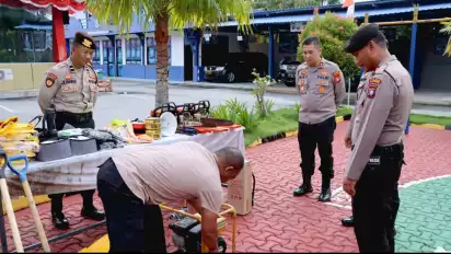 Saat melakukan pengecekan Kapolres didampingi Kabag Ops Polres Karimun bersama Kasat Samapta, peralatan yang digunakan untuk penanganan bencana seperti, alat pemotong, senter, unit mesin air, pcs kantong maya, roll Police line, Arm Protector dan lainnya.
