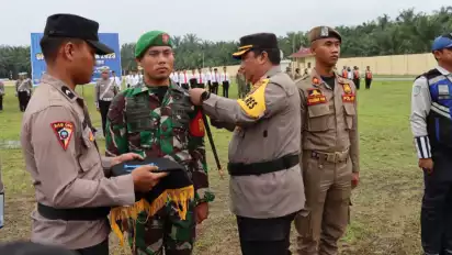Apel gelar pasukan ini di akhiri dengan penyematan pita kepada para petugas yang dilibatkan dalam operasi yang digelar setiap tahun ini sebagai tanda di mulainya operasi zebra toba tahun 2023 di Kabupaten Padang Lawas. (irv/haa)