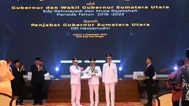Medan, tvOnenews.com – Gubernur dan Wakil Gubernur Sumatera Utara (Sumut) Periode 2018 – 2023, Edy Rahmayadi dan Musa Rajekshah resmi mengakhiri masa jabatannya dan menyerahkan kepemimpinanya kepada Penjabat (Pj) Gubernur Sumut Hassanudin.