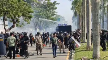 Batam, tvonenews.com - Petugas yang tergabung dari TNI, Polri, satpol PP, dan Direktorat Pengamanan BP Batam memukul mundur massa unjuk rasa penolakan pengembangan Kawasan Rempang dari depan Kantor BP Batam, Senin sekitar pukul 15.30 WIB.