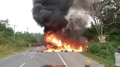 Akibat kecelakaan maut tersebut, mobil Grand Max dan sopirnya hangus terbakar di Tempat Kejadian Perkara (TKP).