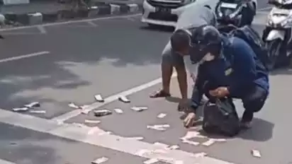 Dalam rekaman video, terlihat pemilik uang yang menggunakan sepeda motor tampak berhenti untuk mengumpulkan uang yang jatuh di jalanan.