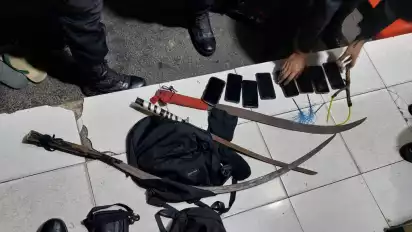 Selain itu, petugas juga berhasil menyita 3 senjata tajam modifikasi, termasuk 2 buah celurit modifikasi dan 1 buah pedang panjang, 1 buah ketapel, dan 3 buah busur kecil yang terbuat dari paku.