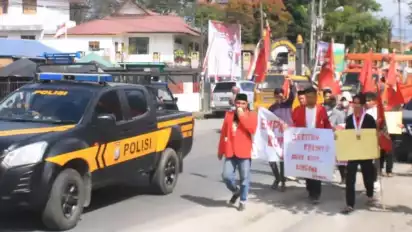 Dairi, tvOnenews.com - Massa dari Gerakan Mahasiswa Nasional Indonesia (GMNI) aksi damai di depan Kantor DPRD dan Bupati Dairi di Jalan Sisingamangaraja, Kecamatan Sidikalang, Dairi, Sumatera Utara, Selasa (24/10/2023).