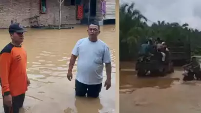 Tidak hanya merendam pemukiman warga, banjir ini juga menggangu akses jalan dan merendam perkebunan sawit.