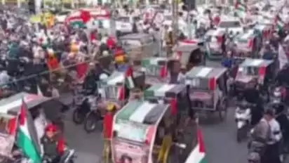 Medan, tvOnenews.com - Para penarik becak motor (parbetor) yang tergabung dalam Abang Becak Peduli Palestina bersama Aliansi Komunitas dan Masyarakat Kota Medan menggelar konvoi di Jalan Sisingamangaraja, Medan, Sumatera Utara.