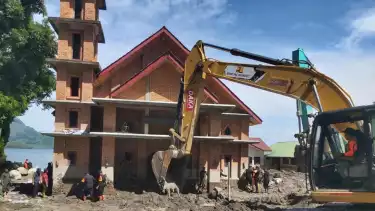Ia menjelaskan di sektor dua, dilakukan pembersihan material yang berada di dalam gereja dan sekolah kemudian pemindahan material dari selokan yang berada di depan hotel menggunakan excavator.