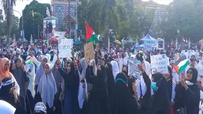 Tak hanya itu saja, massa pun sudah terlihat berdatangan sejak pukul 06.00 WIB. Massa datang lengkap membawa atribut hingga bendera Palestina serta selempang bertuliskan 'Pray for Palestine.'