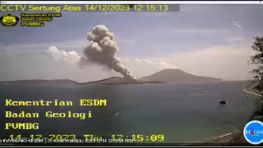 Lampung Selatan, tvOnenews.com - Aktivitas Gunung Anak Krakatau (GAK) di Selat Sunda, Lampung Selatan kembali mengalami peningkatan. Gunung Anak Krakatau mengalami erupsi sebanyak 2 kali dan melontarkan kolom abu mencapai ketinggian 1.000 meter di atas puncak, Kamis (14/12), pukul 05.37 WIB.