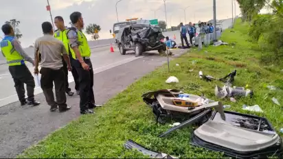 Deli Serdang, tvOnenews.com - Satu keluarga terlibat kecelakaan tragis di Jalan Tol Trans Sumatera, di mana mobil korban datang dari arah tol Medan menuju ke arah tol Tebing Tinggi, tepatnya di KM 47,5 Desa Pasar Melintang, Kecamatan Lubukpakam, Kabupaten Deli Serdang, Sumatera Utara, Selasa (19/12/2023).